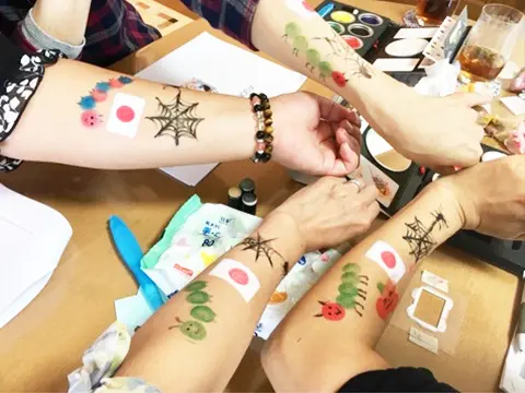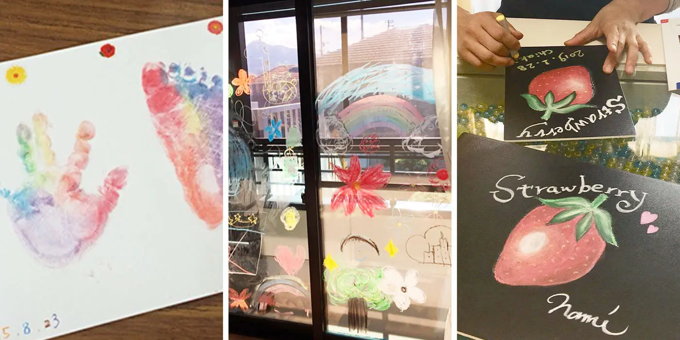 虹色の手形足型を取ったり、窓ガラスやお風呂の壁に自由に落書き、店舗のメニューやサイン、絵の具など、活用方法は無限大!アイディア次第で活用の幅がとても広い画材です。